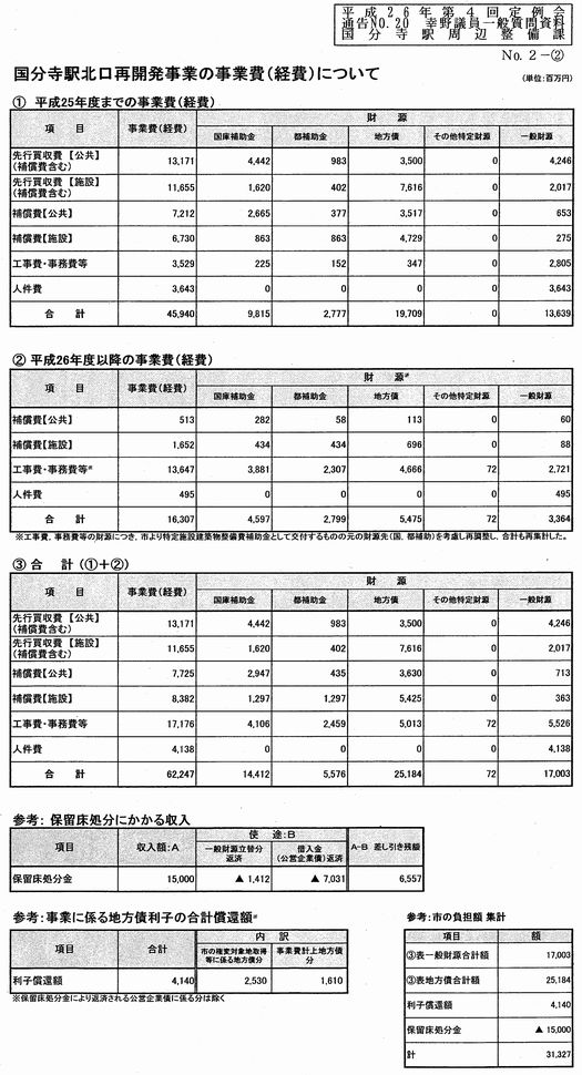 国分寺駅北口再開発にかかる市民の負担について、従来は「200億円」という説明が繰り返し行われてきました。しかし、昨年12月の市議会・一般質問において、私が行った調査を基に資料請求を行った結果、実態は、人件費や借金の利子負担、先行買収の費用などが除かれていたため、「463億円」だった、ということが、明らかになったのです。(画像資料参照)