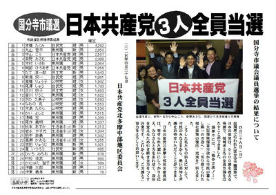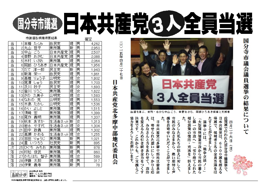 投開票で行われた国分寺市議選挙で、日本共産党は6500票を超える得票で、候補者3名の全員当選を果たすことができました。