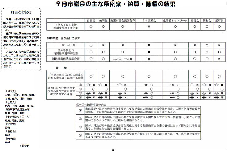 訂正とお詫び 先週、一部地域において日曜版とともに、間違いのあるしんぶん国分寺が配られてしまいました 障害児および特別な支援が必要な児童の保育拡充に関する陳情における①および③④賛成反対を、逆に掲載してしまいました。 みなさんに多大なご迷惑をおかけしてしまったことを深く反省するとともに、二度と繰り返さないように十分に気を付けていきます。